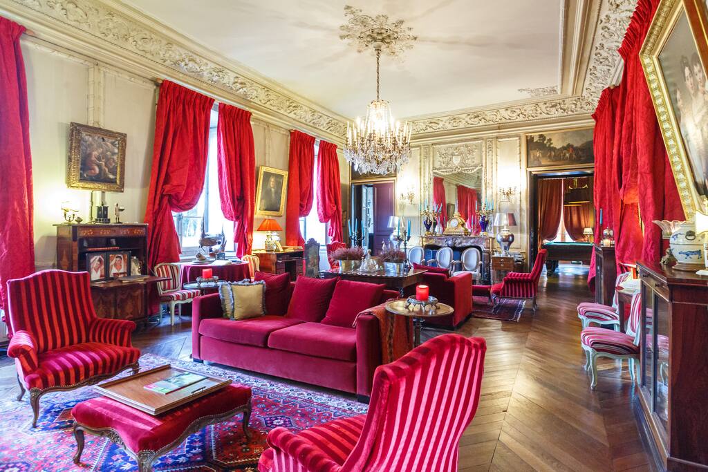 There’s a giant swimming pool, acres of land and interiors covered in the most decadent wallpaper and fabric, while accommodation is fit for 32 persons (17 bedrooms + 15 bathrooms). In the park, you’ll find a short tennis court, golf at 4 km, children’s games and bicycles.